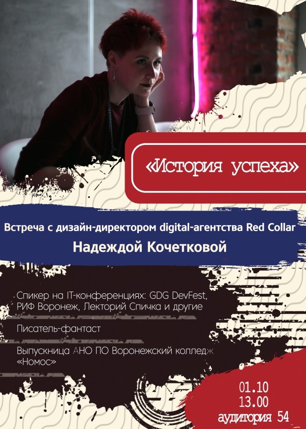 1 октября состоялась встреча с дизайн-директором digital-агентства Red Collar и нашей выпускницей факультета дизайна Кочетковой Надеждой Вячеславовной.